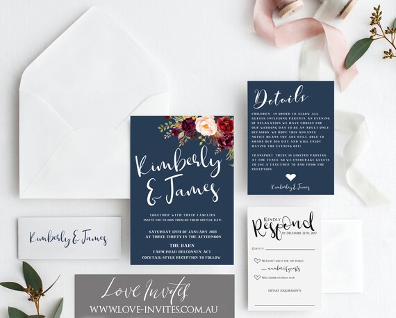 Printable Burgundy Floral Wedding Invitation Set Editable Pdf Etsy