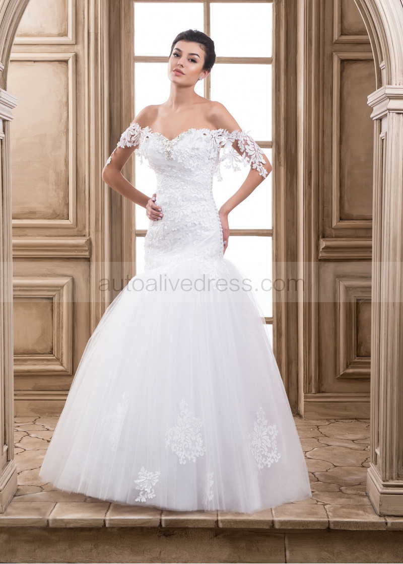White Tulle Lace Appliques Off The Shoulder Corset Wedding Dress