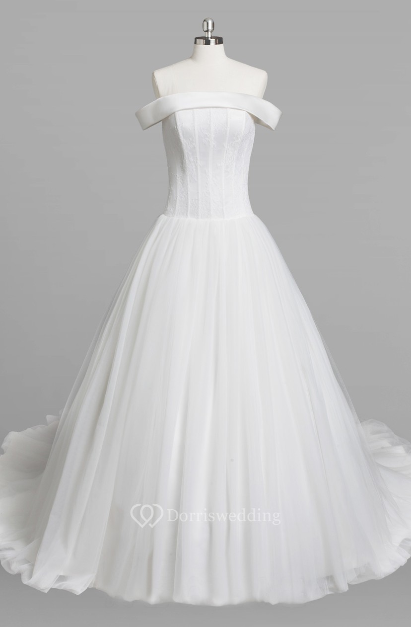 Off The Shoulder Tulle Wedding Dresses Court Train With Lace Trim