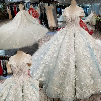 Ls20432g Muslim Ball Gown Wedding Dress With Blue Flowers O Neck