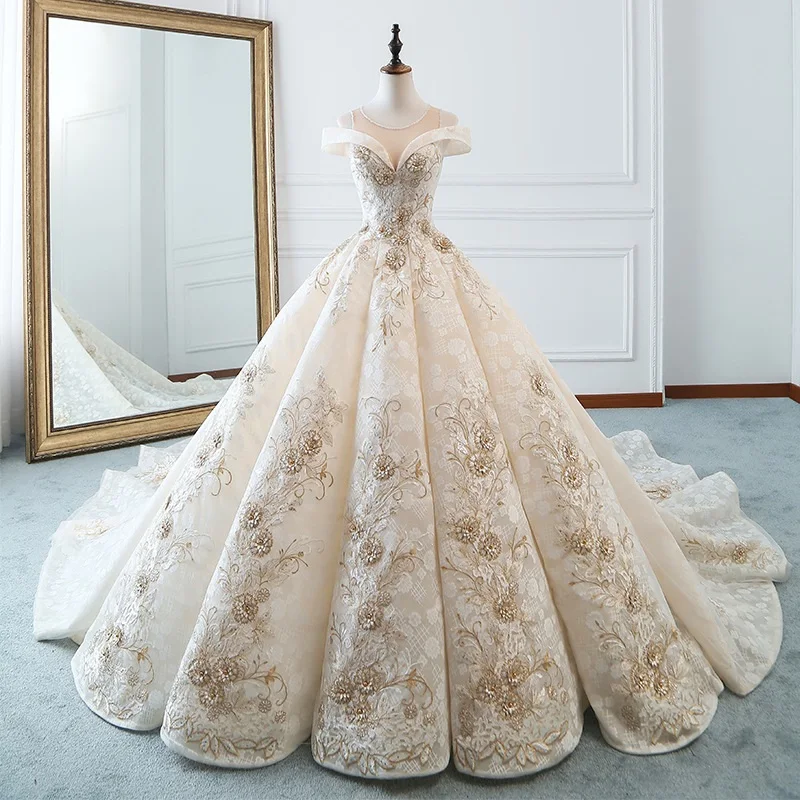 Luxury Gold Embroidery Ball Gown Wedding Dress Off Shoulder