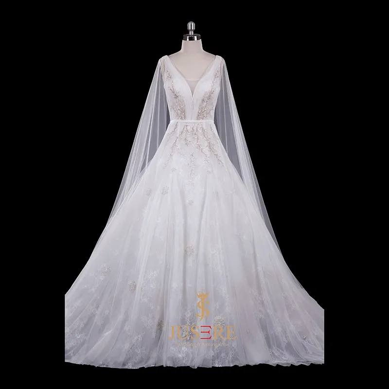 Gold Embroidered Lace Unique V Neck Charming Long Wedding Bridal