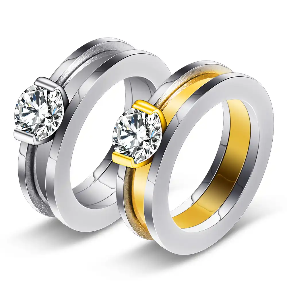 Full Size Three Row Clear Crystal Stainless Steel Wedding Rings